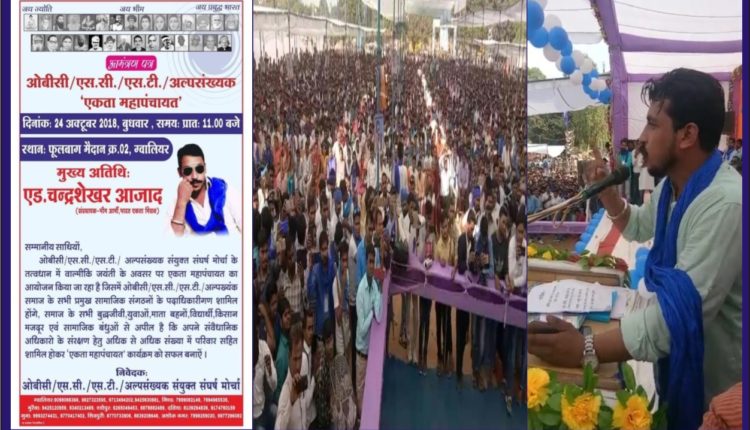 ग्वालियर (मध्य प्रदेश): ग्वालियर के फूलबाग मैदान में ओबीसी-एससी-एसटी-अल्पसंख्यक (OBCs/SC-STs/Mislims) के कई सामाजिक संगठनों व कार्यकर्ता की अपार भीड़ में भीम आर्मी संस्थापक चन्द्रशेखर आजाद ने जनता से अपील की कि कॉंग्रेस और भाजपा को कतई वोट नहीं देना क्योंकि एक साँपनाथ है तो दूसरा नागनाथ है । इन दोनों से आपको सावधान रहना होगा और भूलकर भी इन्हें वोट मत देना।